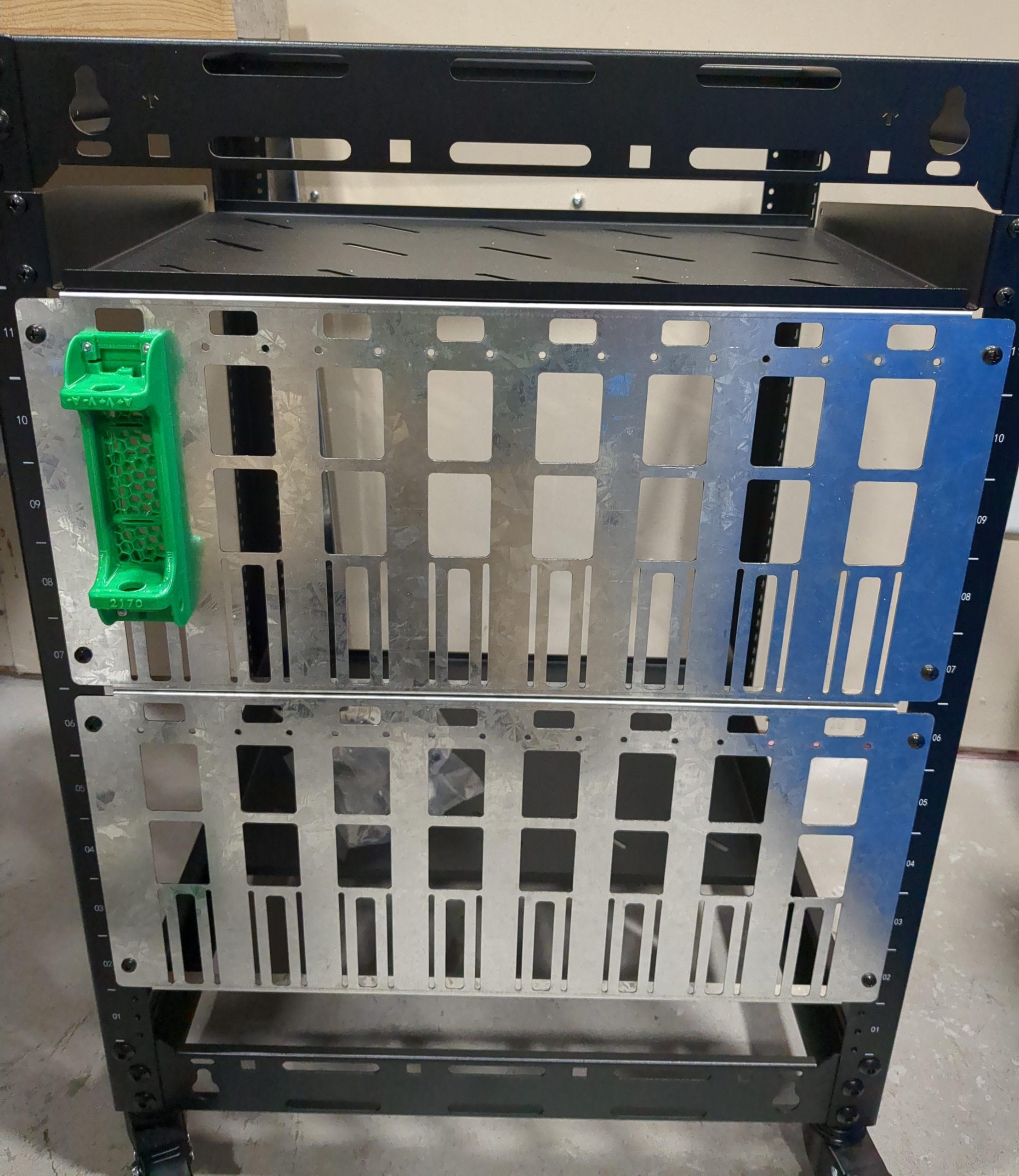 This is a sheet metal part with the appropriate mounting holes to attach 8 cell holders to the front of a standard 19-inch server rack.